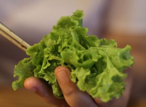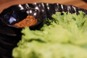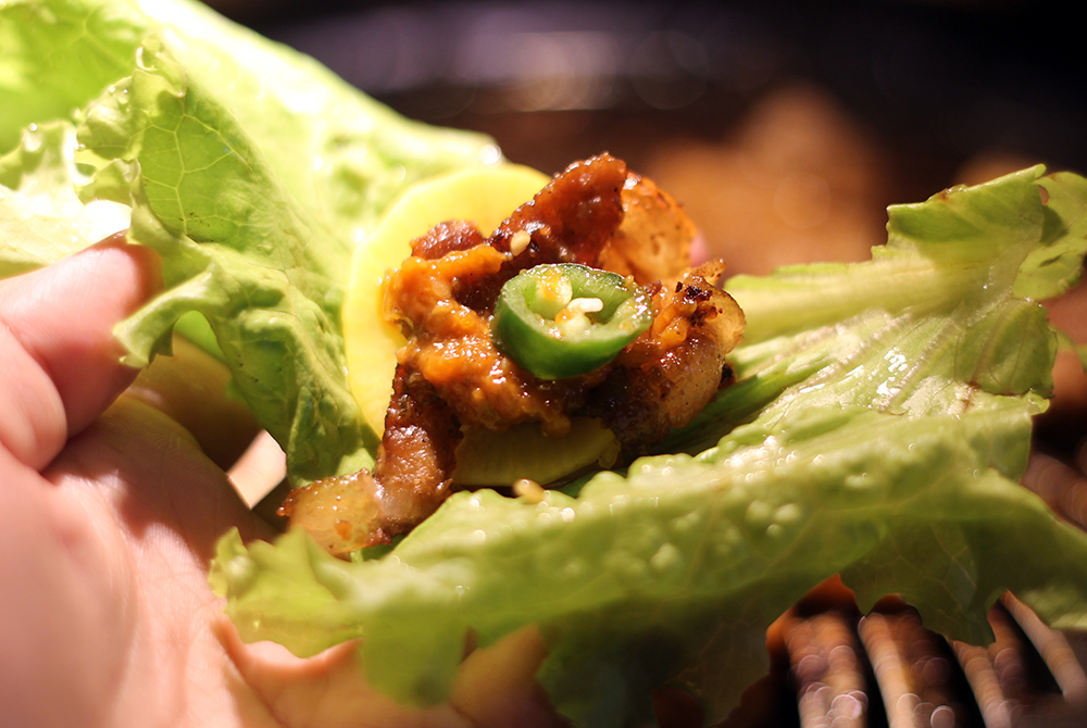 Setelah daging matang dan siap untuk dimakan, Anda bisa membungkusnya (wrapping) seperti yang saya lakukan di bawah ini. Ambil selada, masukkan daging bersama kimchi, irisan lobak, doenjang (sambal Korea yang difermentasi) dan juga cabai hijau. Rasanya akan sangat lezat dan juicy.